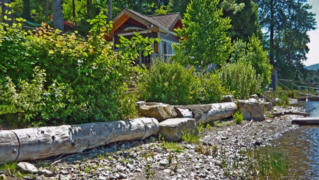 Large, fallen logs are anchored along the shoreline with large boulders, lake shore gravel, and native vegetation. Logs protect the shoreline and vegetation, and act as a smaller, more natural bulkhead. Additionally they serve as a natural seating wall along the beach.