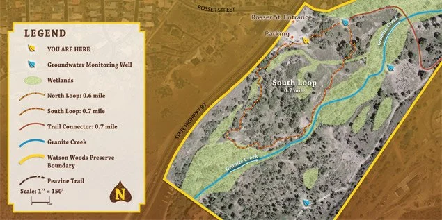 Our GIS folks took data from Prescott Creeks, overlaid it on an aerial photograph, and beautified it into an accurate and visually appealing map that would show users the trails available in the Preserve, as well as Granite Creek’s channel and associated wetlands.
