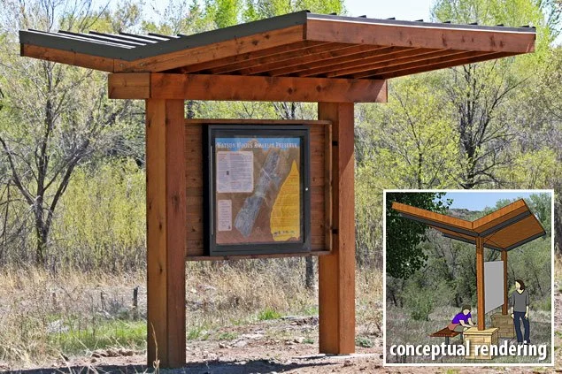 While graphic designers were developing the sign content, landscape architects created conceptual renderings of the entry kiosk, which helped Prescott Creeks envision how it would look on site. They created schematic plans for the selected option, which a local contractor used to build the kiosk.
