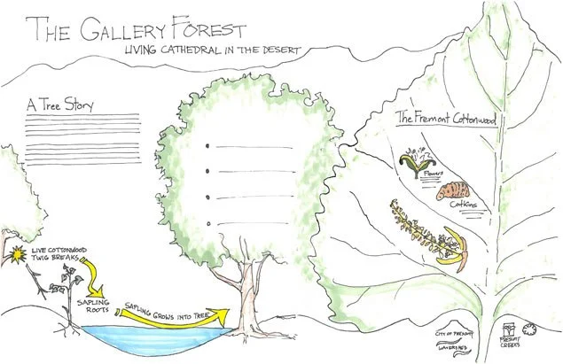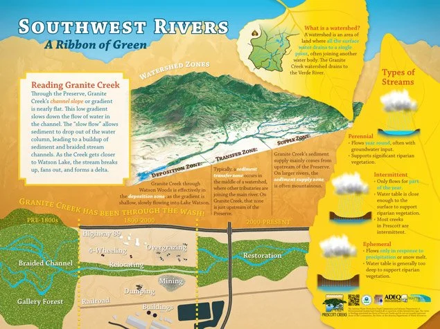 The process of creating five interpretive signs began with interpretive theme development in coordination with Prescott Creeks, and five signs were decided upon: Southwest Rivers, The Gallery Forest, From Pit to Pond, Stream Restoration, and Granite Creek Groundwater.