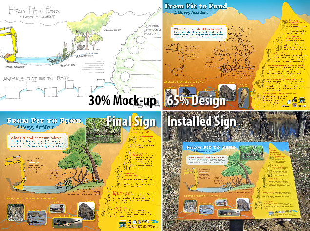Designers created graphic mockups that illustrated the rough layout of each of the interpretive signs. These 30% mock-ups show the planned graphics and areas for text to make sure the content is headed in the right direction for the client’s goals.